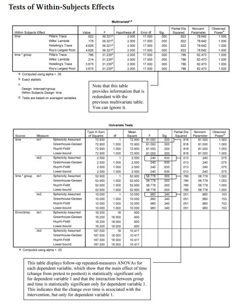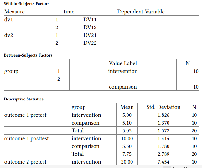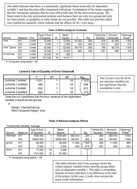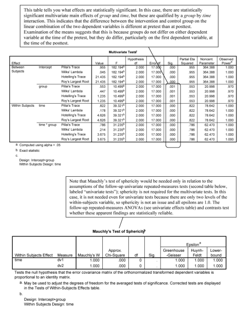 This example illustrates the utility of the doubly multivariate analysis for testing a pretest-posttest design with intervention and control groups. We see from these results not only that the intervention seemed successful when both outcome measures were taken together but also that the effect was statistically significant only for one of the dependent variables, when each was considered separately. Sphericity was not an issue in this case because there were only two levels of the within-subjects variable. If one creates difference scores by subtracting each person’s score on the dependent variable at one level of the within-subjects variable from the same dependent variable at each other level of the within-subjects variable, then sphericity exists if the variances of the resulting difference scores are all equal. Because there are only two levels of the within-subjects variable, there is only one set of difference scores, so sphericity has to exist, which is desirable. If we had had more than two levels of the within-subjects variable, then we would have needed to be concerned about the sphericity assumption when examining the univariate results. If epsilons did not approach 1.0, then we would have used the Huynh-Feldt or Greenhouse- Geisser test results, which use an estimate of epsilon to correct the degrees of freedom. Levene’s Test for homogeneity of variances was not significant, therefore this assumption was met.