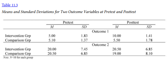 A doubly multivariate analysis was conducted to assess if there was a difference between participants in the intervention group and participants in the control group in the amount of change in their scores on the two outcome measures. (The sample sizes were equal across the groups; therefore, the assumptions were considered to be met.) Statistically significant multivariate effects were found for the main effects of group, F(2, 17) = 10.50, p = .001 and time F(2, 17) = 39.3, p < .001, as well as for the interaction between group and time, F(2, 17) = 31.20, p < .001. This interaction effect indicates that the difference between the intervention and control group on the linear combination of the two dependent variables is different at pretest than it is at posttest. Table 11.3 presents the means and standard deviations on the two variables. Examination of the means shows why the interaction is statistically significant; the groups do not differ much on either dependent variable at the time of the pretest, but they do differ, particularly on the first dependent variable, at the time of the posttest. Follow-up ANOVAs reveal that the statistically significant change from pretest to posttest was statistically significant only for the first outcome variable, F(1, 18) = 81.00, p < .001, and that the change in the first outcome variable was different for the two groups, F(1, 18) = 58.78, p < .001. Figure 11.4 displays the interaction effect for this variable. Examination of the means in Table 11.3 suggests that the change in the first outcome variable only held for the intervention group.