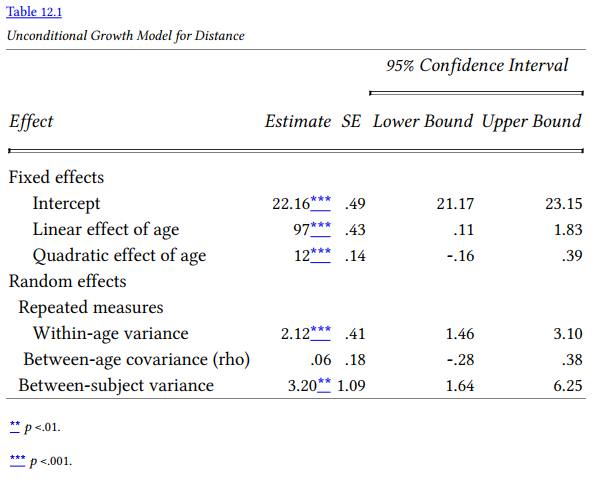 The unconditional repeated-measures model revealed that there was significant variability in the distance measure, suggesting that it would be worthwhile to examine a conditional model that could potentially explain some of this variability. (The assumptions of independent observations at the level above the nesting, bivariate normality, linear relationships, and random residuals were checked and met.) The linear trend for age was a statistically significant predictor of changes in the distance measure, t(78.55) = 2.25, p = .027. On the other hand, the quadratic trend for age was not significant, indicating that age was related to the distance from center of pituitary to pteryomaxillary fissure measure in a linear manner. Examination of the means for the four age supported this, indicating that there was a steady, linear increase in the measure from age 8 until age 12 periods (M = 22.19, 23.17, 24.65, and 26.09; SD = 2.43, 2.16, 2.82, and 2.77 for ages 8, 10, 12, and 14, respectively). There also was substantial and statistically significant within-age and between-subject variance (see Table 12.1). In contrast, it appeared unnecessary to model the covariance matrix as a first-order autoregressive matrix; there were small, nonsignificant intraclass correlations among adjacent age levels in the distance variable, rho =.047, Wald Z = .273, p = .785. Thus, scores for each age level were relatively independent of one another once overall differences between individuals were taken into account.