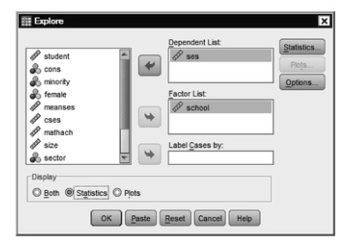 - First, calculate the means for each school for SES: Click on Analyze →Descriptive Statistics → Explore.