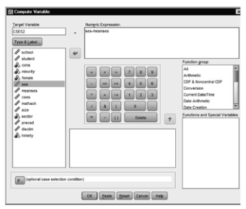Compare the mean for several schools to the values listed for meanses in your Data Editor. You will see slight rounding differences, but basically the same values for the means. Note that SES is already centered on the grand mean for all participants, so some means are negative and some are positive. Grand mean centering is another method that is commonly used in conjunction with multilevel models, especially when predictors from different levels are included in the same equation. Which mean you use in centering depends on your research question. We are not including the output for the group mean centering we are doing here in order to save space.