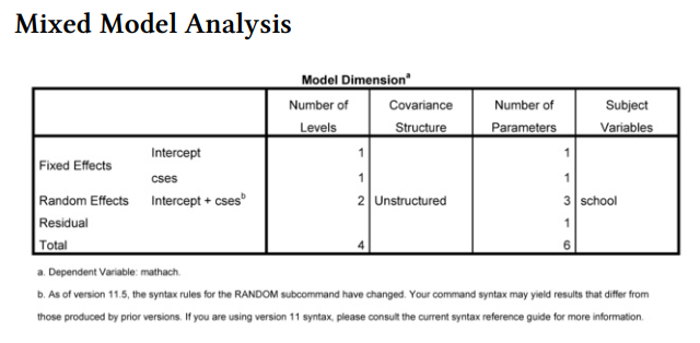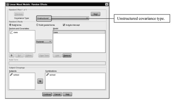 Interpretation of Output 12.4 continued The next entries in this table are less familiar and harder to interpret from the labels that are given, which is why we requested the Random Effect Covariance Structure, by checking Covariances of random effects in the Statistics menu. The line in the Estimates of Covariance Parameters table that is labeled UN (1,1) is the (unstructured) variance associated with differences between schools. As the Random Effect Covariance table indicates, the (1,1) indicates that it is the covariation of this effect with itself, or variance. In contrast to the decline in the within-schools variance component, the betweenschools variance component actually increased a negligible amount in the conditional model, from 8.61 in Output 12.3 to 8.68 in Output 12.4. The next line in the Estimates of Covariance Parameters table, which is labeled UN (2,1), is the covariance between differences due to cses and differences between schools, as again made clearer in the Random Effect Covariance table. The final line in the Estimates of Covariance Parameters table that is labeled UN (2,2) is the variance associated with differences within schools that are due to cses.