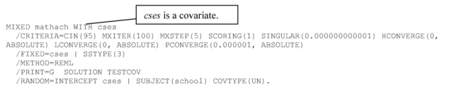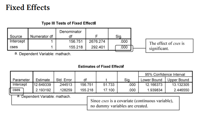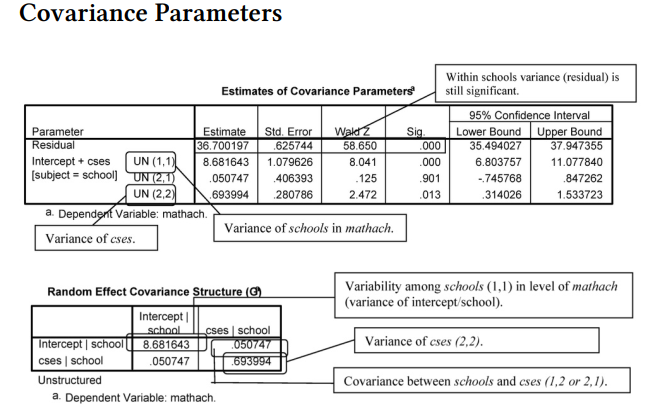 Interpretation of 12.4 continued The two previous tables provide information about the Fixed Effects. Note that cses, F(1, 155.22) = 292.4 is statistically significant at p < .001. Moreover, in the Covariance Parameters tables (next), we see that the within schools residual still is statistically significant, Wald Z = 58.65, p < .001, although, as we see by comparing this table with the one in Output 12.3, the variance component estimate has decreased from 39.15 to 36.70. This makes sense, because we are explaining some of this within-school variability by using cses as a predictor.