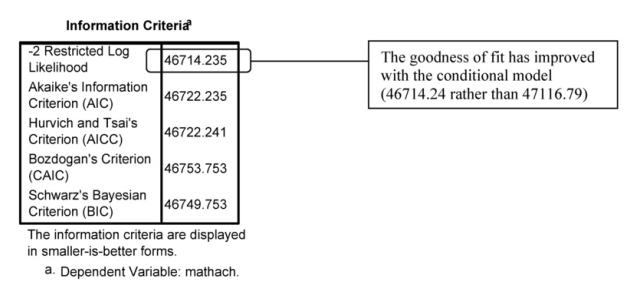 Interpretation of Output 12.4 (continued) Next, you see the Information Criteria, providing goodness-of-fit data for this new model. If you compare the -2 restricted log likelihood, which is a useful measure of goodness of fit, for this model (46714.24) and for the unconditional model (47116.80), you can see that the goodness of fit has improved by almost 403. Again, smaller numbers indicate better fit. We will again do a likelihood ratio after we go through Output 12.4, to see if this is a significant improvement in the model.