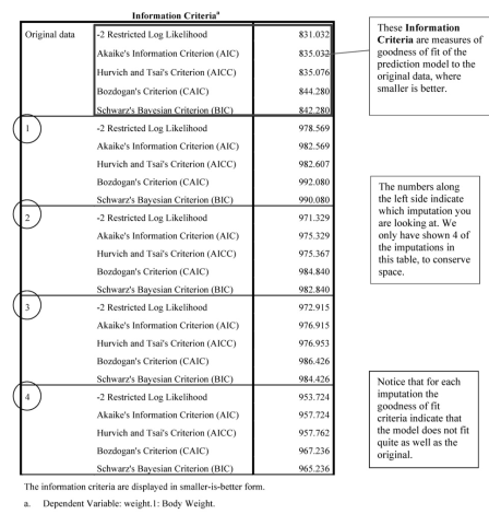 The Information criteria table indicates goodness of fit of the model with the data, with smaller numbers indicating better fit. Note that the imputed data, for each of the five imputations shown, have somewhat poorer fits to the data. However, we will see below that the results of the tests predicting weight from the time various predictors are highly significant for the imputed models. Remember that we only have provided results for the first 5 imputations.