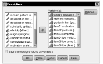- While holding down the control key (i.e., the key marked “Ctrl”), click on all of the variables in the left box that we called ordinal so that they are highlighted.. These include father’s education, mother’s education, grades in h.s., and all the “item” variables (item 01 through item 11 reversed). Note that each of these variables has the symbol , which indicates that it was called ordinal in the variable view.