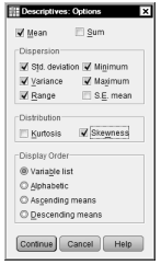 After selecting Descriptives, you will be ready to compute the mean, standard deviation, skewness, minimum, and maximum for all participants or cases on all the variables that we initially called ordinal under Measure in the Variable View of the Data Editor.