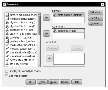- Move math grades to the Rows box using the arrow key and put gender in the Columns (Where to move these variables is a decision for the researcher. When one of the variables has more levels, it can make interpretation easier if this variable is in the Row(s) box.)