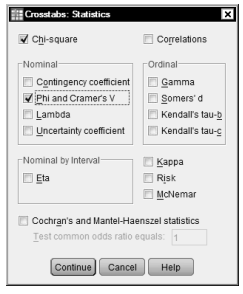 - Check Chi-square and Phi and Cramer’s V. The window should look like Figure 7.2.