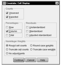 - Now, ensure that Observed is checked; also in Fig. 7.3, check Expected under Counts, and Column under Percentages. It helps the interpretation if the total of the percentages of students for each level of the presumed independent variable (gender, in this case) adds up to 100%. Because gender is the column variable, we checked Column.