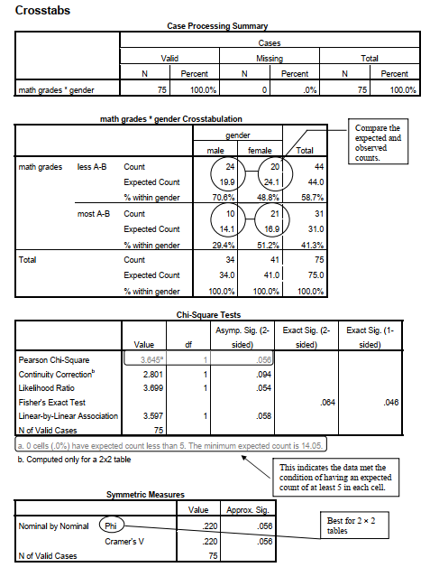The case processing summary table indicates that there are no participants with missing data. The Crosstabulation table includes the Counts and Expected Counts, and each cell also has a % within gender. For example, there are 24 males who had low math grades (less than A – B); this is 71% of the 34 male students. On the other hand, 20 of 41 females had low math grades; that is only 49% of the females. It looks like a higher percentage of males had low math grades. The ChiSquare Tests tables tell us whether we can be confident that this apparent difference is not due to chance.