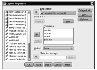 LOGISTIC REGRESSION VARIABLES alg2 /METHOD=ENTER gender mosaic visual parEduc