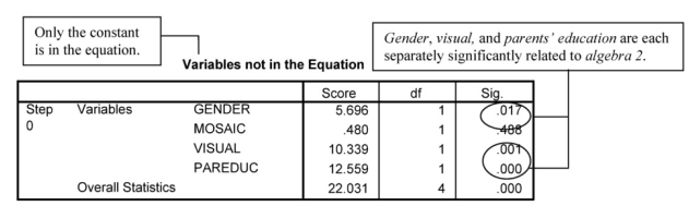 There are three main parts to this output. First, two tables provide descriptive information (see callout boxes). Next, there are three tables in Block 0 that provide information about the baseline situation, when only the constant is in the equation or model. That is, how well can we predict algebra 2 without using gender, parents’ education, mosaic, or visualization test, if we predicted that all the students would not take algebra 2? The last section of four tables is below Block 1. They show the results when the four predictors are entered simultaneously.