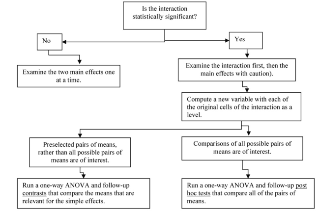 In the interpretation of Output 9.1, we indicated that you should examine the interaction F first. If it is statistically significant, it provides important information and means that the results of the main effects may be misleading. Figure 9.4 is a decision tree that illustrates this point and guides the analysis in this section. It shows two ways to examine the simple effects when you have a significant interaction. You would use either contrasts or post hoc tests, not both.