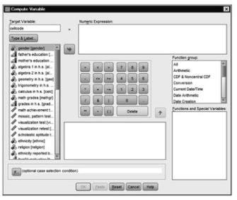 - Type mathgr = 0 & faedRevis = 1 in the window. You are telling SPSS to compute level 1 of the new variable, cellcode, so that it combines the first level of math grades (0) and the first level of father’s education revised (1) (see 9.7).