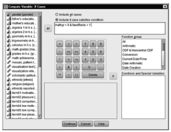 - Type mathgr=1 & faedRevis=1 in the box. You are now telling SPSS to use the other (higher) level of math grades with the first level of father’s education revised.