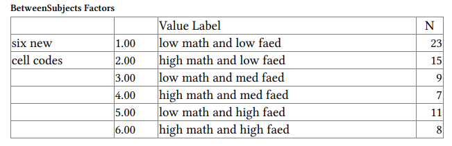 To analyze the simple effects, we first need to compute a new variable with each of the original cells as a level. To do this, do the following commands.