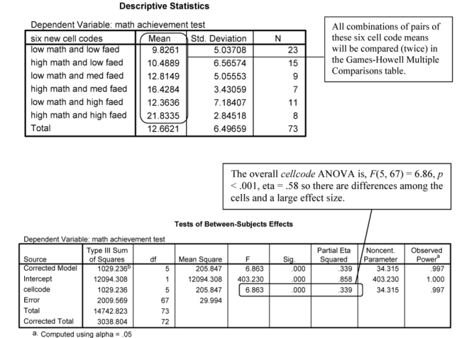 Thus, what we have done with the above instructions is simple effects, first comparing students with high and low math grades who have fathers with less than a high school education. Second, we have compared students with high and low math grades who have fathers with some college. Finally, we have compared students with high and low math grades who have fathers with a B.S. or more. Look back at how we computed the cellcode variable (or the syntax and Descriptives in Output 9.2c) to see why this is true. Note that in cases like this it might be easier to type the syntax, which is part of the reason many experienced SPSS users prefer to use syntax. However, you must type the syntax exactly correctly or the program will not run.