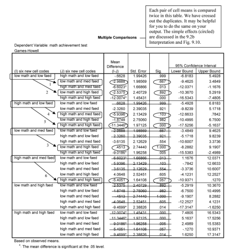 The Multiple Comparisons table is very complex. It includes comparisons of all possible combinations of pairs of cellcode means, twice. We have crossed out duplicates to simplify the table some. Even then there are 15 paired comparisons, and some are more meaningful than others. One useful set of comparisons is to test the difference between high and low math grades at each level of father’ s education. We have done this in Output 9.2c and Fig. 9.11 with contrasts. Similar comparisons are made in this table. Can you find them?