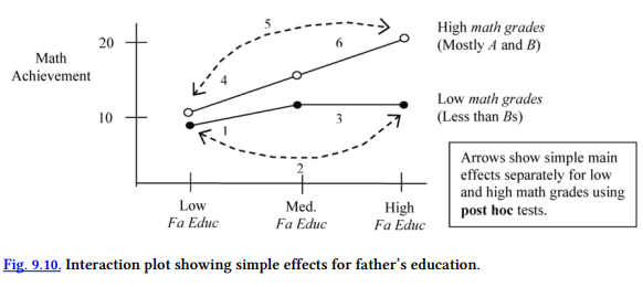 Another set of meaningful comparisons is identified by the circles in the Multiple Comparisons table and by Fig. 9.10. These post hoc comparisons show that there are no significant differences between any of the three pairs of means for the low math grades line in Fig. 9.10. The p values for comparisons 1, 2, and 3 are .667, .892, and 1.00, respectively. Can you see them in the figure and table?