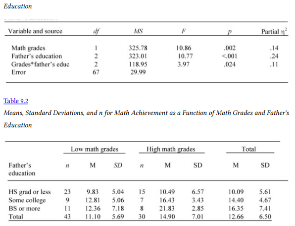 Table 9.1 shows that there was a significant interaction between the effects of math grades and father’s education on math achievement, F(2,67) = 3.97, p = .024, partial eta2 = .11. (The assumptions of independent observations was met, and assumptions of homogeneity of variances and normal distributions of the dependent variable for each group were checked. The assumption of homogeneity of variances was violated; thus, results should be viewed with caution. The assumption of normal distributions of the dependent variable for each group was not violated.) Table 9.2 shows the number of subjects, the mean, and standard deviation of math achievement for each cell. Games-Howell post hoc tests revealed that, of students with low math grades, level of father’s education did not seem to be associated with differences in math achievement. In contrast, for those who had mostly A and Bs in math, high father education was associated with statistically significantly higher math achievement than low father education (p < .001, d = 2.02). This effect size is considered large according to the literature.