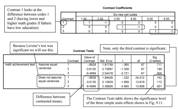 This output is the result of doing the bottom left-hand step, shown in Fig. 9.4, for interpreting a statistically significant interaction. Using Output 9.2c, we can examine three main simple effects statistically. The first table, Descriptives, provides the means of the six new cell code groups that will be compared, two at a time, as shown in the Contrast Coefficients table. The second table is Levene’s test for the assumption that the variances are equal or homogeneous. In this case, the Levene’s test is significant, so the assumption is violated and the variances cannot be assumed to be equal. The third table is the ANOVA table. Again, the overall F(5,67) = 6.86 is significant (p < .001), which indicates that there are significant differences somewhere. The Contrast Tests table helps us identify which simple effects were statistically significant. We will focus on one set of simple effects in our interpretation, the ones based on t tests that do not assume equal variances. Note that we have circled three Sigs. (the significance level or p). These correspond to the three simple effects shown with arrows in our drawing of the interaction plot (Fig. 9.11). For example, the left-hand arrow (and the first contrast) compares math achievement scores for both high and low math grades of students whose fathers have a relatively low education level.