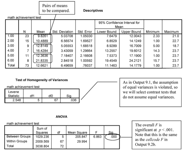The second table is Descriptive Statistics showing the six new cell code means computed in Output 9.2a. The Tests of BetweenSubjects Effects table provides an overall or omnibus ANOVA (circled) that indicates there are significant differences among the six cellcode means. However, we are almost always more interested in the comparisons of pairs or other subsets of the means. Post hoc multiple comparisons allow you to test all combinations of pairs of means or at least more combinations of interest than are allowed using contrasts.