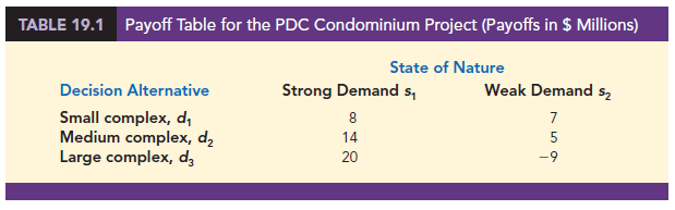 Because PDC wants to select the complex size that provides the largest profit, profit is used as the consequence. The payoff table with profits expressed in millions of dollars is shown in Table 19.1. Note, for example, that if a medium complex is built and demand turns out to be strong, a profit of $14 million will be realized. We will use the notation Vj to denote the payoff associated with decision alternative i and state of nature j. Using Table 19.1, V31 = 20 indicates a payoff of $20 million occurs if the decision is to build a large complex (d3) and the strong demand state of nature (s1) occurs. Similarly, V32 = -9 indicates a loss of $9 million if the decision is to build a large complex (d3) and the weak demand state of nature (s2) occurs.