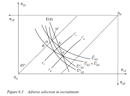 This process of sorting employees into groups, however, requires that ability is observable, and we have assumed that ability cannot be observed. Of course unobservability would not matter if people could be trusted to declare accurately their level of skill assuming that they, at least, know what it is. But Figure 6.3 illustrates that the unskilled will have an incentive to lie about their ability. An unskilled person will have a higher utility index if he or she can obtain a contract at b (UAU) than he would have at a (UAU). Thus, like the craftspeople in their dealings with person A in Chapter 2, unskilled people may misrepresent their skill level and attempt to ‘contaminate’ high- skill-level firms. By undermining the firms with contracts at b, the forces of adverse selection thus lead to generally higher levels of incentive pay in the surviving firms with contracts at a.