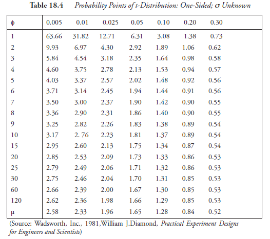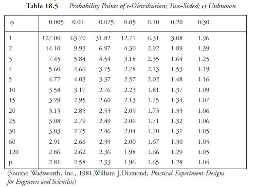 Note: The use of probability points for α and β, taken from Table 18.2, was good only for the first iteration, done above, for calculating N. For the second iteration, the probability points, in place of α and β, should be taken from Tables 18.4 and 18.5, which present t-distribution points, the values designated as tα and tβ. Table 18.4 provides values of tα and tβ when the alternate hyposthesis stated in step 2 is “one (single) sided.” Table 18.5 provides those values when the alternate hypothesis is “two double) sided.” Also, note that the t-distribution points are given in Tables 18.4 and 18.5, corresponding to Φ, the degree of freedom, a new parameter. These are the major differences.