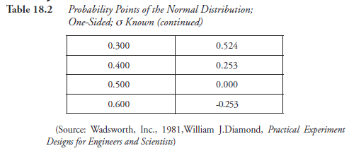Note: The use of probability points for α and β, taken from Table 18.2, was good only for the first iteration, done above, for calculating N. For the second iteration, the probability points, in place of α and β, should be taken from Tables 18.4 and 18.5, which present t-distribution points, the values designated as tα and tβ. Table 18.4 provides values of tα and tβ when the alternate hyposthesis stated in step 2 is “one (single) sided.” Table 18.5 provides those values when the alternate hypothesis is “two double) sided.” Also, note that the t-distribution points are given in Tables 18.4 and 18.5, corresponding to Φ, the degree of freedom, a new parameter. These are the major differences.