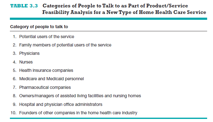 In some instances, you have to pause and think carefully about who the potential customer is. For example, in health care the “customer” is typically not the patient who will use the drugs or benefit from a medical procedure. Instead the actual customer, or the entity that will be paying the bill, is often an insurance company, hospital, or Medicare or Medicaid. You should also talk to as many of the relevant players in an industry as possible. Sometimes this involves a complex list of people, but it is necessary to fully vet the initial feasibility of an idea. For example, say you were thinking about launching an innovative new type of home health care service. The service would allow elderly people to stay in their homes longer before going into assisted living or a nurs- ing home, and it would help people remember to take their medicine on time and provide other health care monitoring services. Table 3.3 contains a list of the categories of people that you might want to talk to as part of your product/ service feasibility analysis. While the list is long, imagine the rich insight that you could get on your business idea from people in these categories.