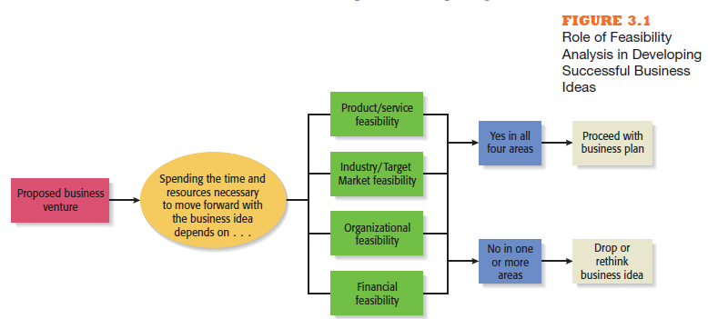 Feasibility analysis is the process of determining if a business idea is viable (see Figure 3.1). If a business idea falls short on one or more of the four compo- nents of feasibility analysis, it should be dropped or rethought, as shown in the figure. Many entrepreneurs make the mistake of identifying a business idea and then jumping directly to developing a business model (see Chapter 4) to describe and gain support for the idea. This sequence often omits or provides little time for the important step of testing the feasibility of a business idea.