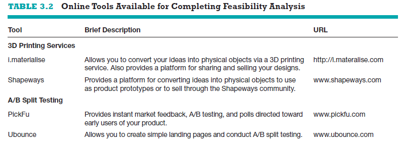 Rather than developing a formal concept statement, some entrepreneurs conduct their initial product/service feasibility analysis by simply talking through their ideas with prospective customers or conducting focus groups to solicit feedback. The ideal combination is to do both—distribute a concept statement to 20 or more people who can provide informed feedback and engage in verbal give-and-take with as many industry experts and prospective custom- ers as possible. There are also a growing number of online tools that help entre- preneurs quickly and inexpensively make contact with prospective customers and complete other steps in the feasibility analysis process. These tools range from services like Quirky, which provides direct feedback on product ideas, to 3D printing services like Shapeways, which converts CAD drawings of product ideas into physical prototypes that you can show to potential customers. We provide a sample of the online tools that are available in Table 3.2.