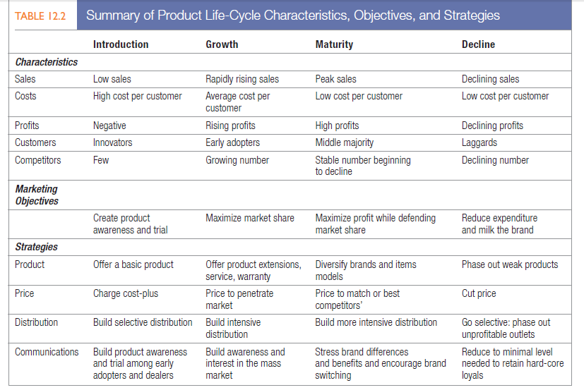 Table 12.2 summarizes the characteristics, marketing objectives, and marketing strategies of the four stages of the product life cycle. The PLC concept helps marketers interpret product and market dynamics, conduct planning and control, and do forecasting. Another study by Golder and Tellis of 30 product categories unearthed a number of interesting findings about the PLC:90