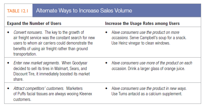 MARKET MODIFICATION A company might try to expand the market for its mature brand by working with the two factors that make up sales volume, number of brand users and usage rate per customer, as in Table 12.1, but competitors may match this strategy.