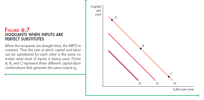 Two extreme cases of production functions show the possible range of input substitution in the production process. In the first case, shown in Figure 6.7, inputs to production are perfect substitutes for one another. Here the MRTS is constant at all points on an isoquant. As a result, the same output (say q3) can be produced with mostly capital (at A), with mostly labor (at C), or with a bal- anced combination of both (at B). For example, musical instruments can be man-