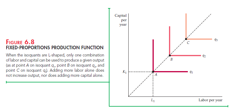 Figure 6.8 illustrates the opposite extreme, the fixed-proportions produc- tion function, sometimes called a Leontief production function. In this case,