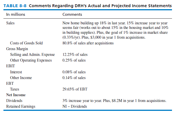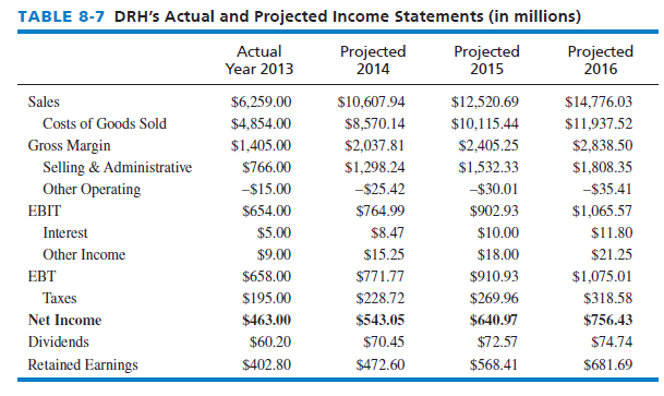 Based on these recommendations, DHR’s actual and projected income statements are given in Table 8-7. Note the large increase in sales in 2014 were due to DRH potentially acquiring four smaller homebuilder companies. Note also at the bottom of Table 8-7 the dividends to be paid and resultant annual retained earnings to be carried forward to the DRH projected balance sheets. Commentary regarding DRH’s actual and projected income statements is provided in Table 8-8.
