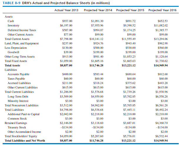 Table 8-9 reveals DRH’s actual and projected balance sheets given the four recommendations listed earlier and the annual retained earnings carried forward to the balance sheet. Table 8-10 provides commentary regarding the projected balance sheet changes.