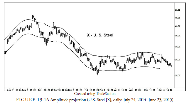 Figure 19.15 also shows how amplitude can vary enormously. Indeed, the variation is so large that prediction is almost impossible. We can only conjecture what the future might bring in amplitude because, so far, no reasonable and consistent method exists. In this example, what can help in amplitude projection, however, is the concept of nesting. Cycles tend to oscillate within cycles. Thus, their outer boundaries, as defined by envelopes, can give us a rough estimate of what to expect for amplitude. Again, let us look at our same data example, this time shown in Figure 19.16 with a 34-day cycle envelope.