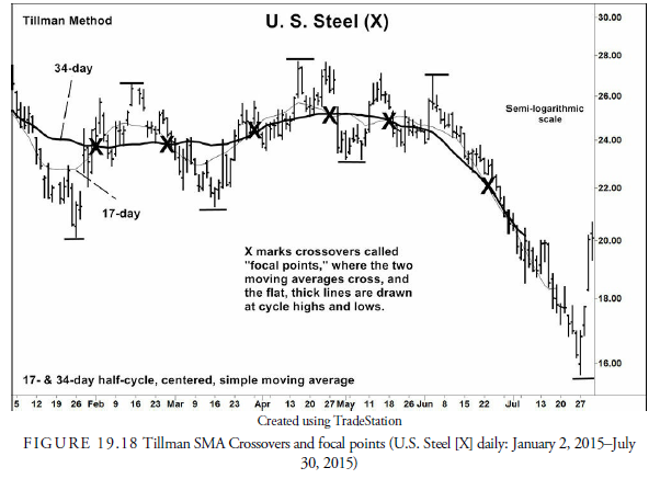 Tillman’s analysis concentrates on what he calls focal points. Focal points occur when three or more half-cycle, centered, moving averages cross at roughly the same location. In Figure 19.18, crossovers of two half-cycle moving averages (17-day and 34-day) are shown rather than three, for clarity.