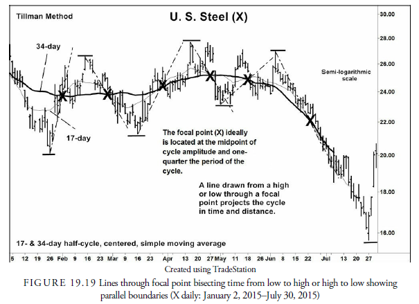 One observation is that focal points occur at roughly the halfway point of cycle advances or declines. Notice the thick horizontal lines at the 18-day cycle peaks, the troughs, and the Xs at the crossovers in Figure 19.18. The crossovers occur roughly halfway between the peak and trough in points. The practical problem