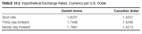 In Table 10.2, the forward krone is at a premium since the forward krone is more expensive than the spot. The forward Canadian dollar is at a discount because its forward price is cheaper than spot. When viewed from the point of view of the U.S. dollar, it can also be stated that the forward dollar is at a discount in relation to the krone or that the forward U.S. dollar is at a premium in relation to the Canadian dollar.