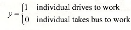 If we collect a random sample of workers who commute to work, then the outcome y will be unknown to us until the sample is drawn. Thus, y is a random variable. If the probability that an individual drives to work is p, then P[y = 1] = p . It follows that the probability that a person uses public transportation is P[y = 0] = 1 – p. The probability function for such a binary random variable is