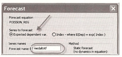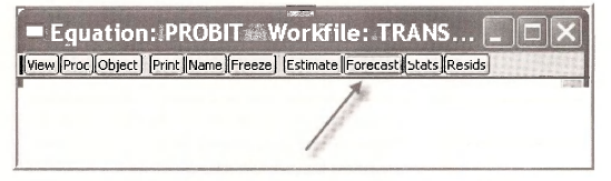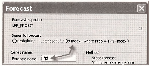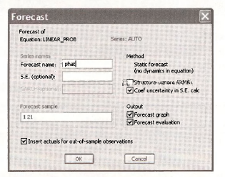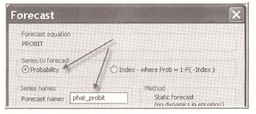 In the resulting Forecast dialog box choose the Series to forecast to be the Probability, and assign the Forecast name PHAT PROBIT. Click OK.