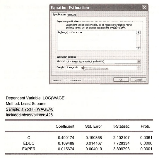 First, let us estimate a simple wage equation, explaining \n{WAGE) as a function of the woman’s education, EDUC, and years of market work experience (EXPER), using the 428 women who have positive wages. Select Quick/Estimate Equation. Fill the dialog box as