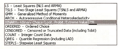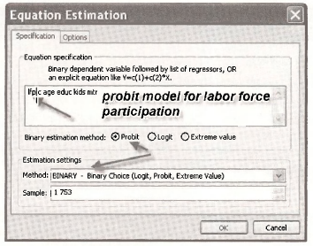 where Φ(z) is the probit function, which is the standard normal cumulative distribution function (CDF). This is a nonlinear model because the parameters β1 and β2 are inside the very nonlinear function Φ(•). Using numerical optimization procedures, that are outside the scope of this book, we can obtain maximum likelihood estimates. From the EViews menubar select Quick/Estimate Equation. In the resulting dialog box, click the pull down list in the Method section of Estimation settings