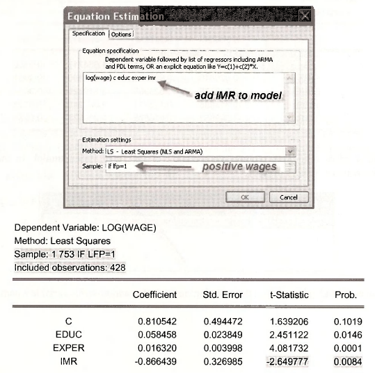 This two-step estimation process is a consistent estimator, however the standard errors Std. Error do not account for the fact the IMR is in fact estimated. If the errors are homoskedastic, we however can carry out a test of the significance of the IMR variable based on the /-statistic that is reported by EViews. This is because under the null hypothesis that there is no selection bias the coefficient of IMR is zero, and thus under the null hypothesis the usual t-test is valid. Here we reject the null hypothesis of no selection bias and conclude that using the two-step Heckit estimation process is needed.