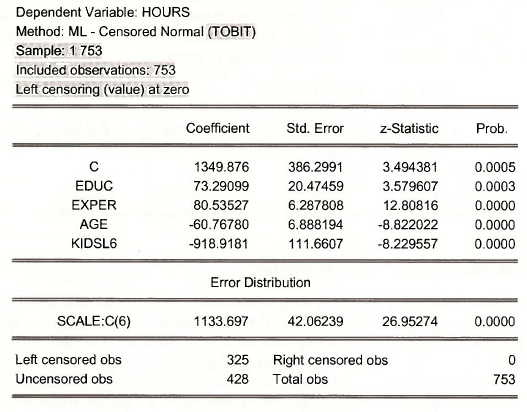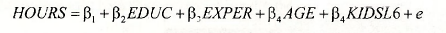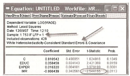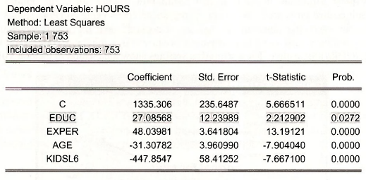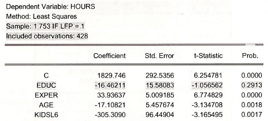 The estimation results are shown below. Note that the included observations are 428. The estimation results now show the effect of education (EDUC) to have a negative, but insignificant, affect on HOURS. In the estimation using all the observations EDUC had a positive and significant effect on HOURS.
